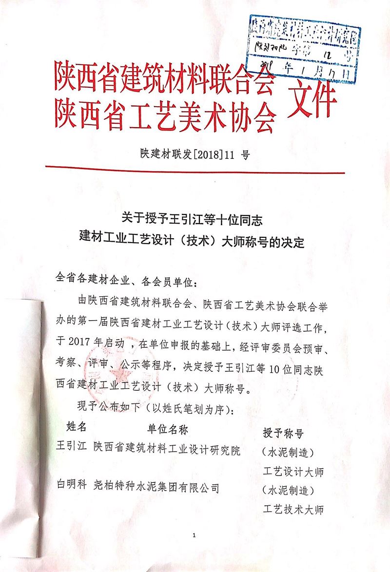 由陜西省建筑材料聯(lián)合會、陜西省工藝美術協(xié)會聯(lián)合舉辦的第一屆陜西省建材工業(yè)工藝設計(技術)大師評選工作于2017年啟動,在單位申報的基礎上,經評審委員會預審、考察、評審、公示等程序,我院王引江被授予陜西省建材工業(yè)工藝設計(技術)大師稱號。