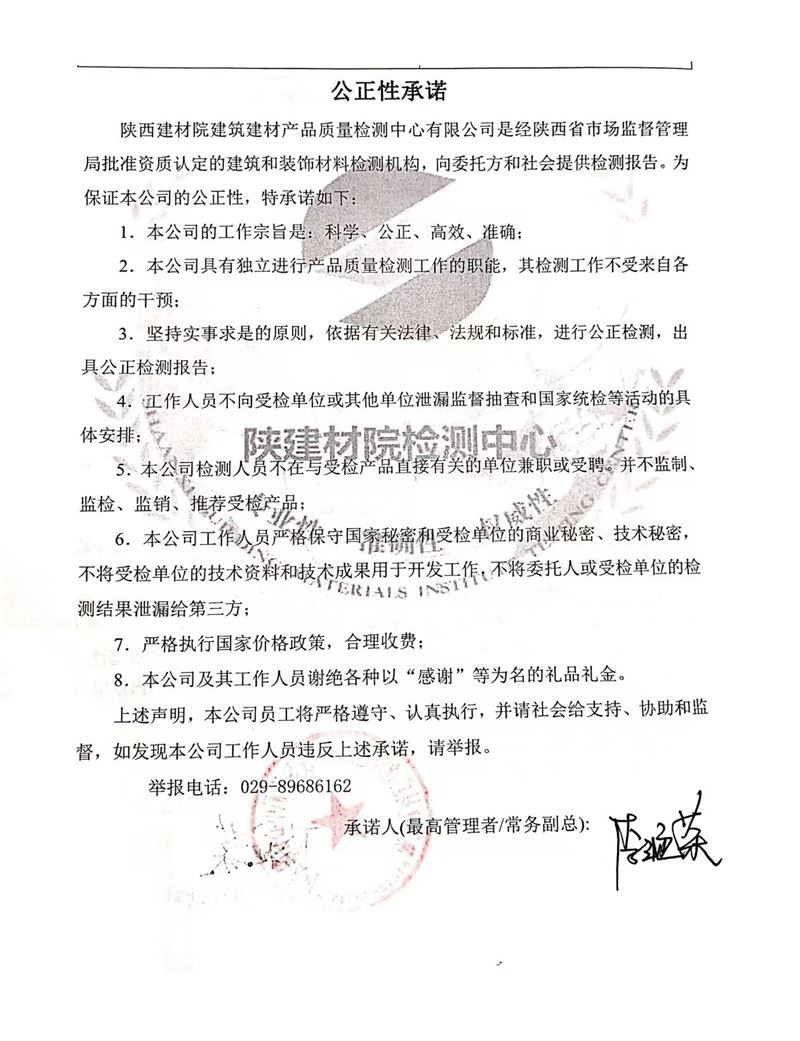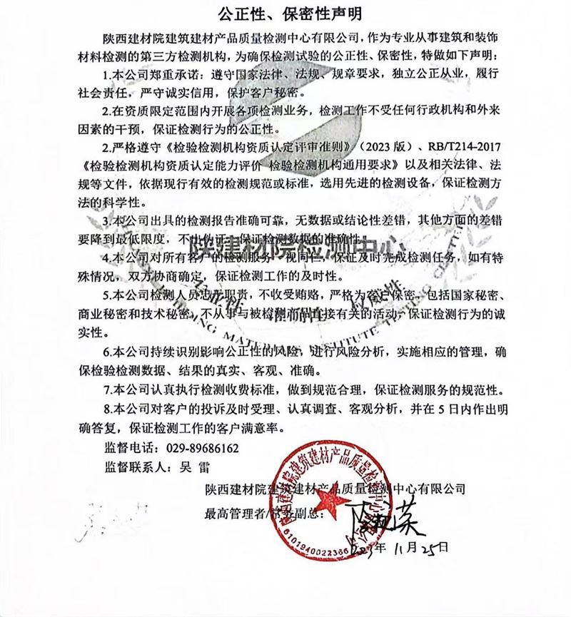陜西建材院建筑建材產(chǎn)品質(zhì)量檢測中心有限公司公正性聲明